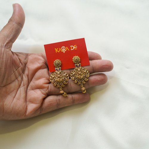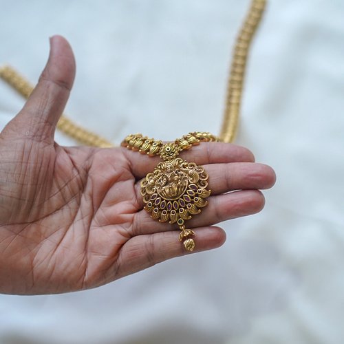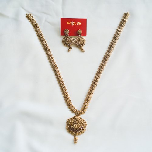 The Antique Lakshmi Temple Haaram Necklace Set by Karra De showcases exquisite South Indian artistry. Crafted in antique gold with detailed Lakshmi motifs and ruby accents, this haaram embodies traditional beauty and divine grace, making it ideal for bridal and festive occasions.