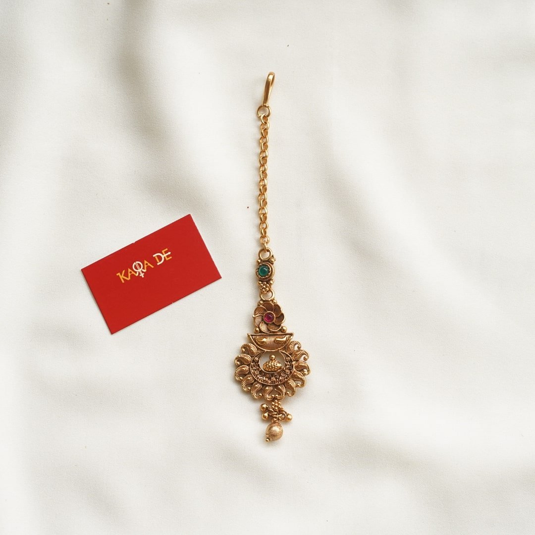Antique gold maang tikka featuring temple-inspired craftsmanship with ruby and emerald accents.