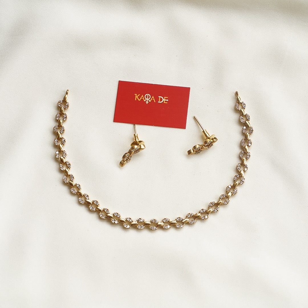 The Classic Crystal Tennis Necklace Set from Karra De exudes understated glamour. Crafted with fine clear crystals in a slim design, it’s perfect for daily wear, celebrations, and minimalist bridal styling.