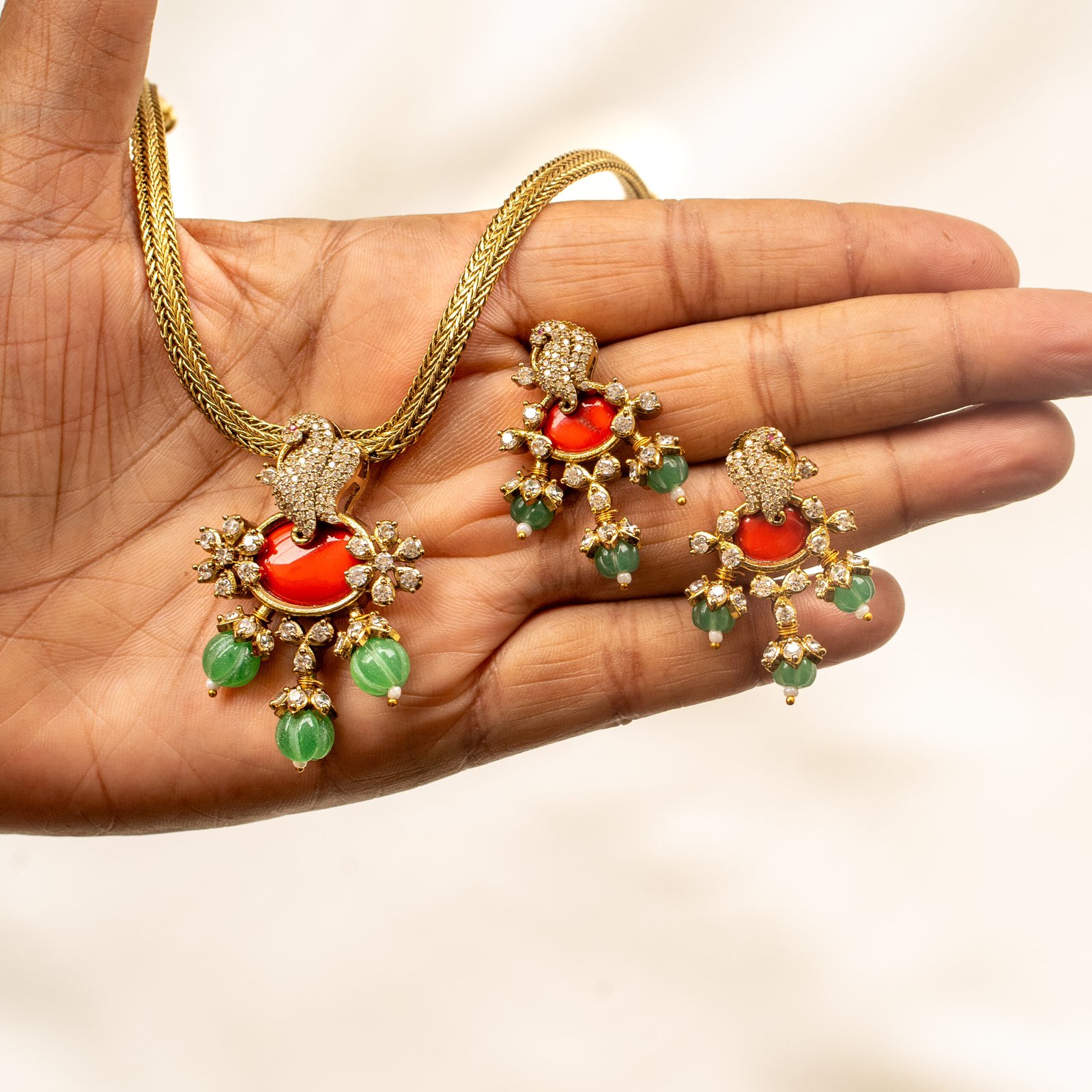 The Coral Emerald Fusion Necklace Set by Karra De brings together coral and emerald tones in a stunning fusion of modern and ethnic artistry. Adorned with crystal accents, this design adds a pop of color and sophistication, ideal for cocktail parties or festive occasionS.