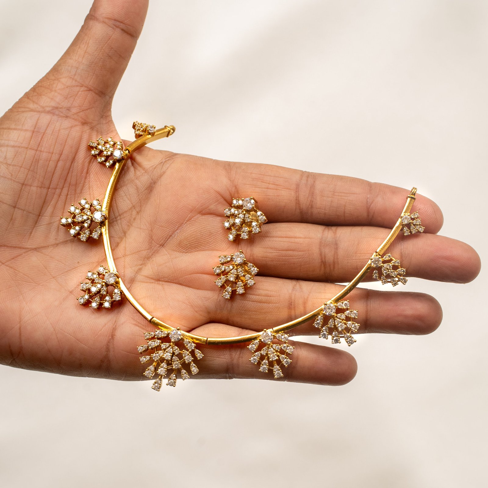 Elegant gold necklace set with crystal clusters — modern sparkle for festive wear.