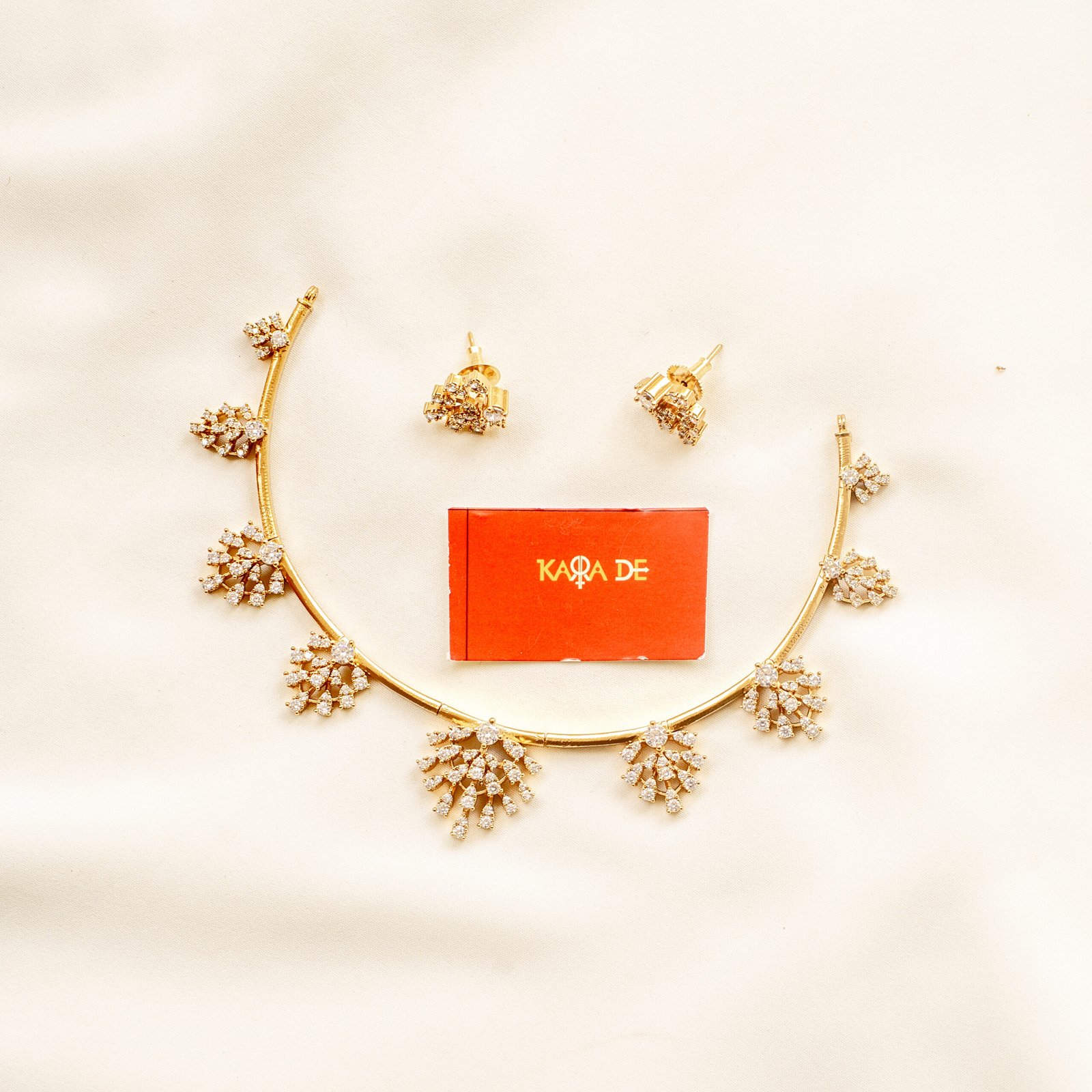 The Crystal Bloom Necklace Set from Karra De showcases a blooming floral design crafted from premium crystals. Its radiant sparkle adds a contemporary twist to classic gold jewelry, perfect for weddings, receptions, and parties. Lightweight yet luxurious, this piece elevates every outfit.