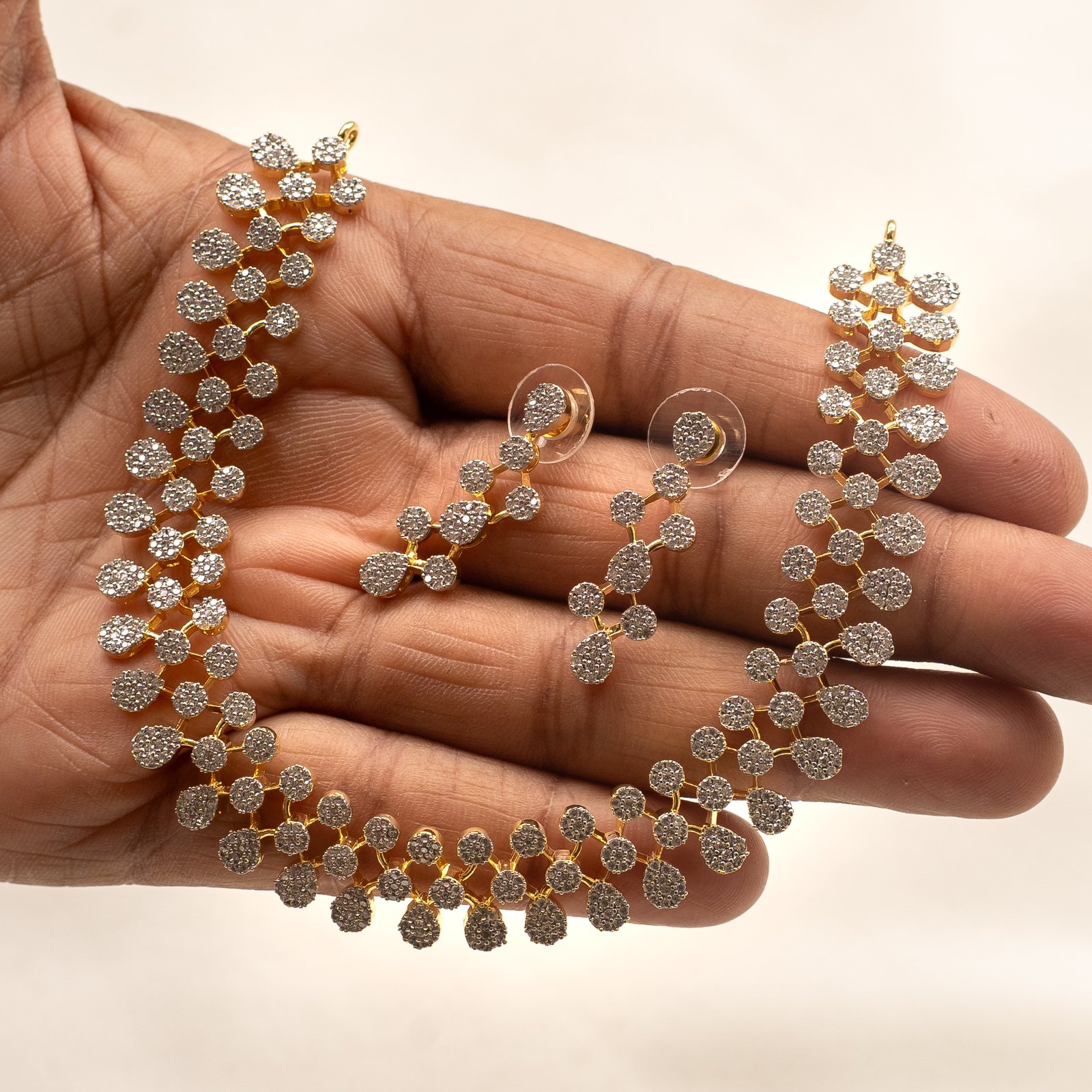 The Crystal Cluster Silver-Gold Neckpiece Set from Karra De redefines modern glamour with its shimmering crystal clusters and dual-tone finish. Designed to radiate brilliance, this neckpiece perfectly complements cocktail gowns, festive sarees, and evening ensembles.