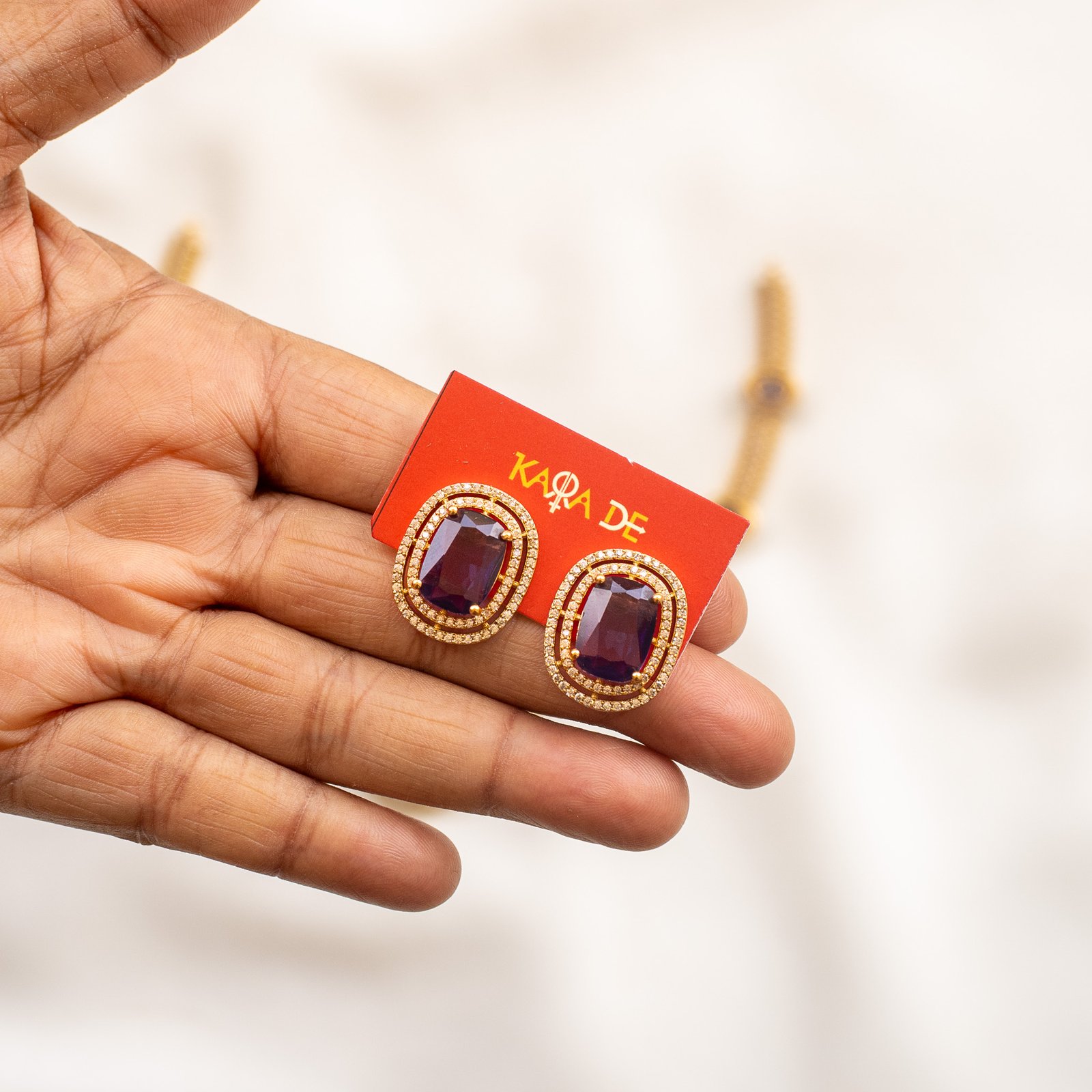 The Deep Violet Crystal Necklace Set by Karra De is an expression of royal beauty. Featuring bold violet gemstones set in gold, this design offers elegance and poise for parties, receptions, and cultural gatherings. A must-have for lovers of refined statement jewelry.