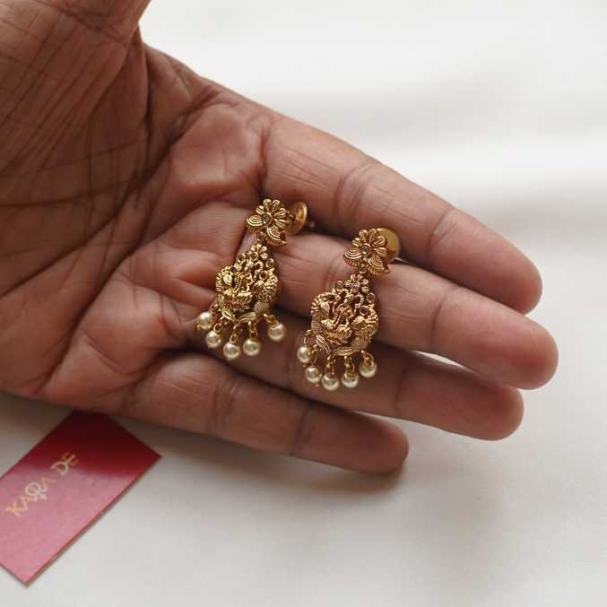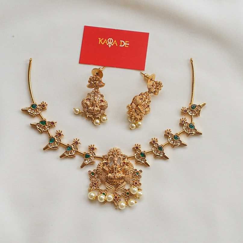 The Divine Lakshmi Pearl Temple Neckpiece by Karra De features Goddess Lakshmi and peacock motifs with pearl embellishments. This exquisite handcrafted piece embodies South Indian artistry and heritage charm.