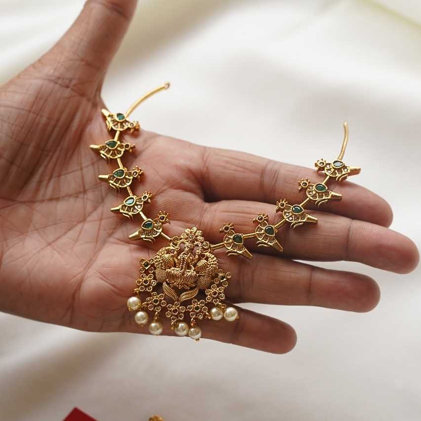 Antique gold neckpiece with Lakshmi motifs and pearl accents — divine and traditional.