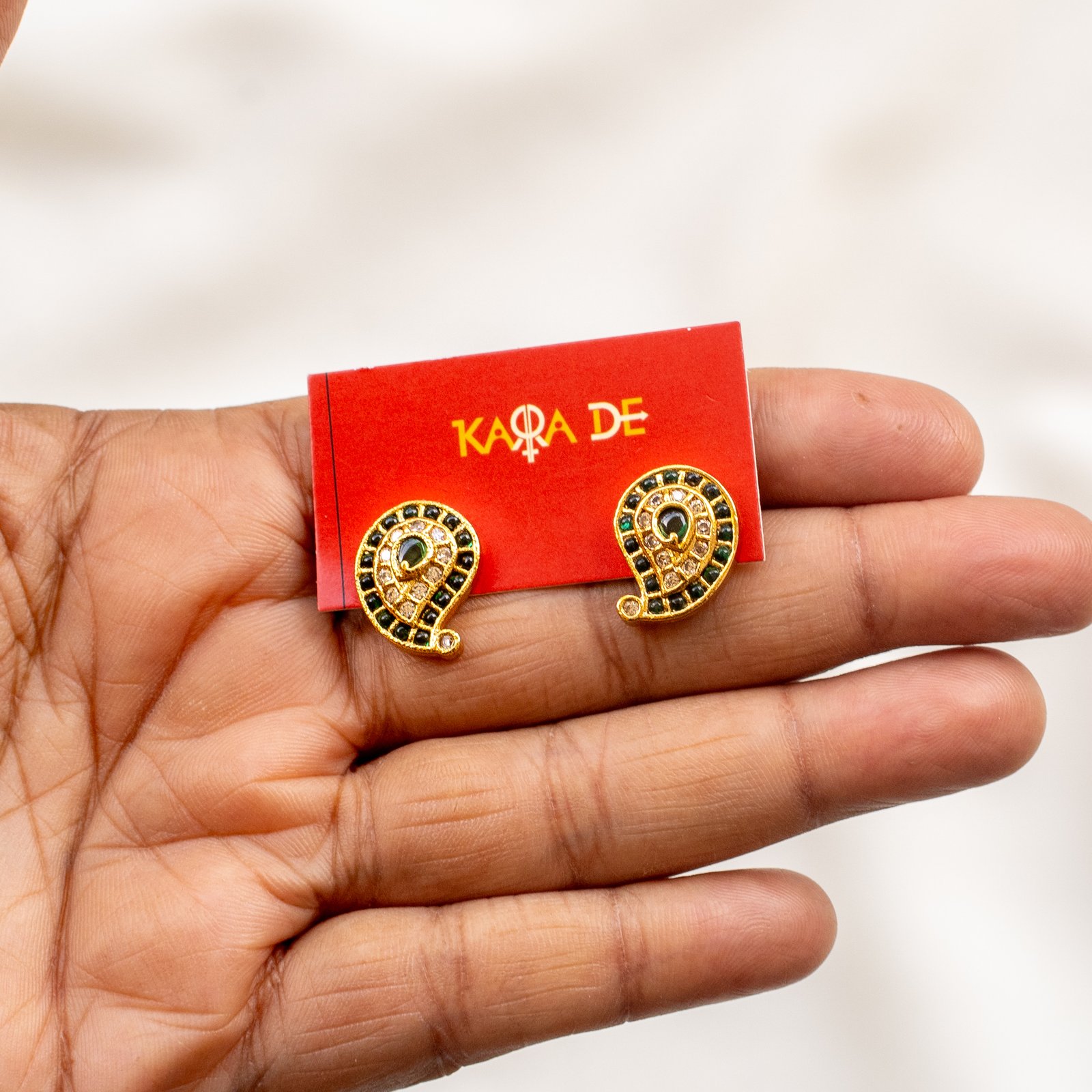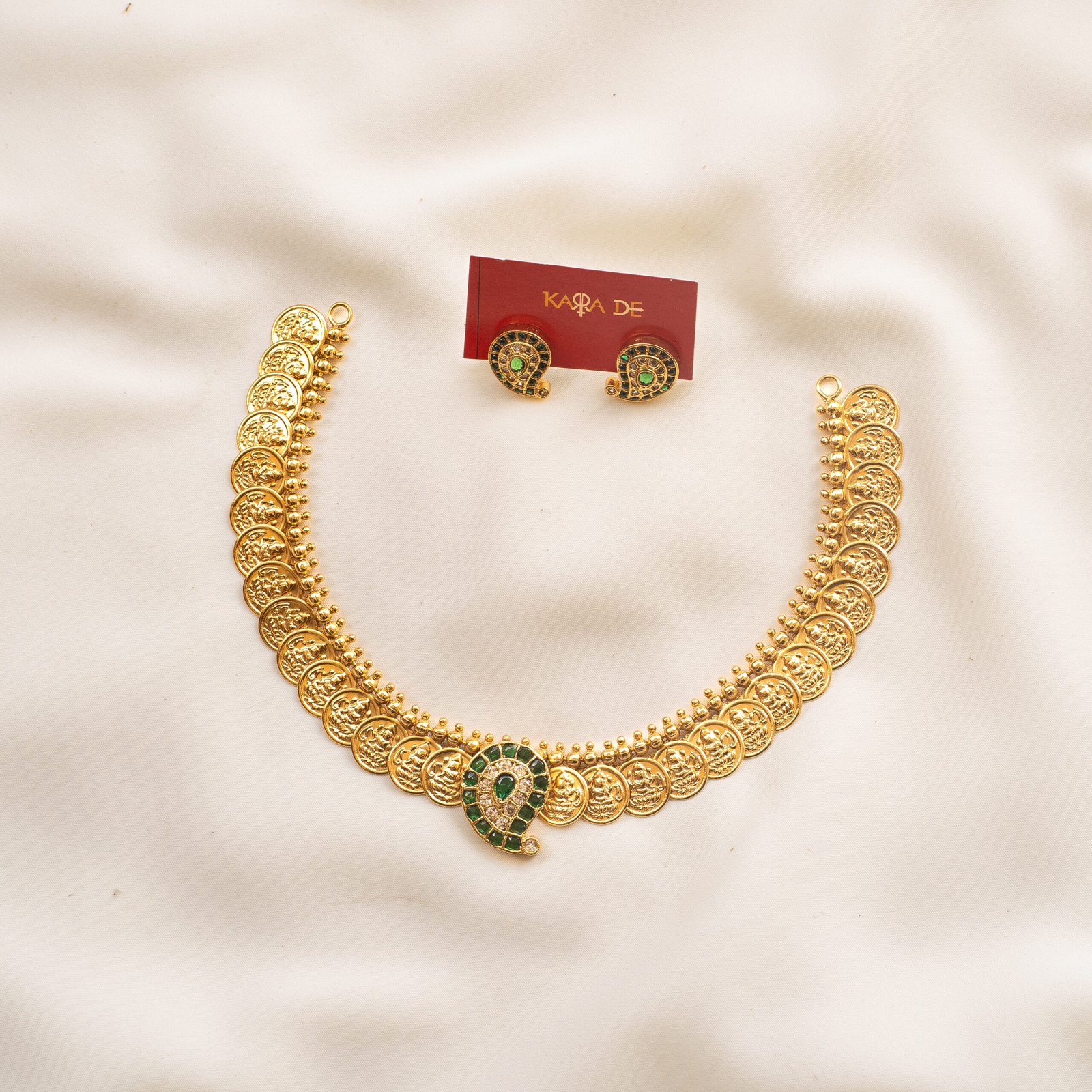The Emerald Coin Heritage Necklace Set from Karra De revives South Indian temple artistry with its antique coin motifs and emerald-encrusted peacock pendant. Crafted with precision and a matte gold finish, it pairs beautifully with silk sarees and festive attire, radiating divine charm and prosperity.