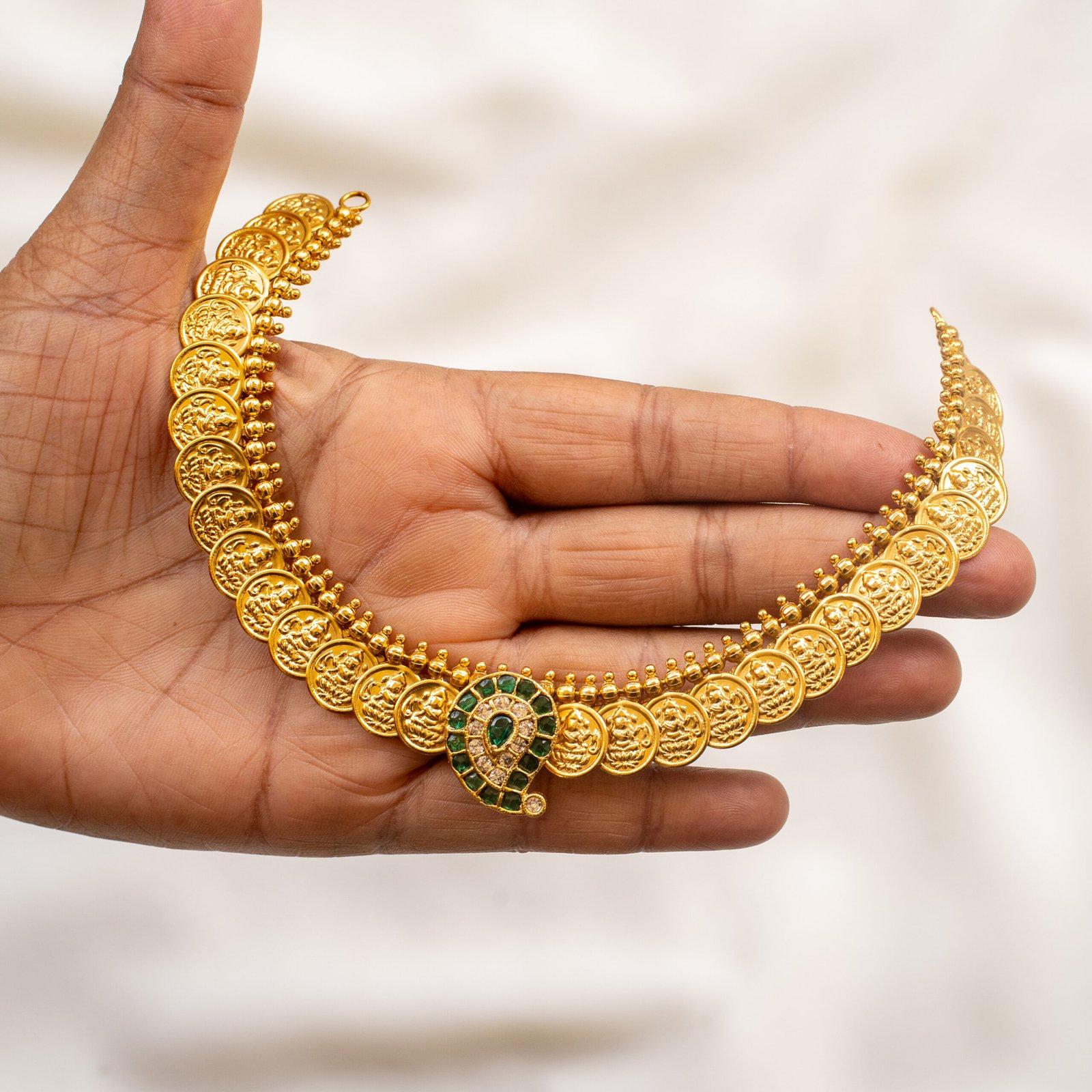 Traditional gold coin necklace with emerald peacock design — a perfect fusion of culture and elegance.