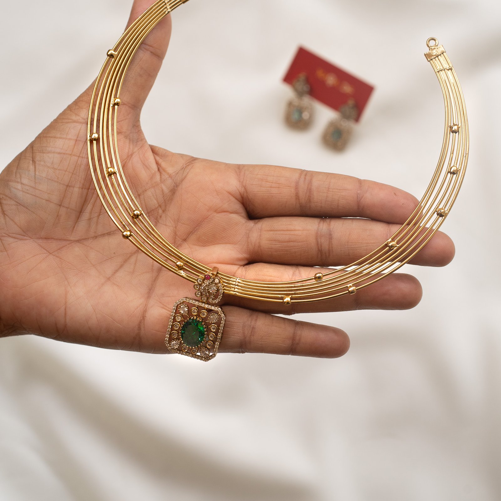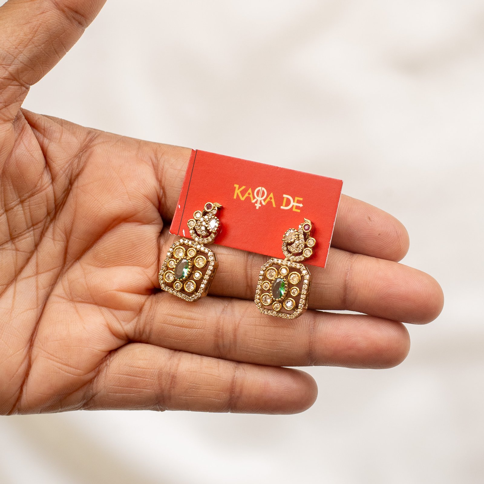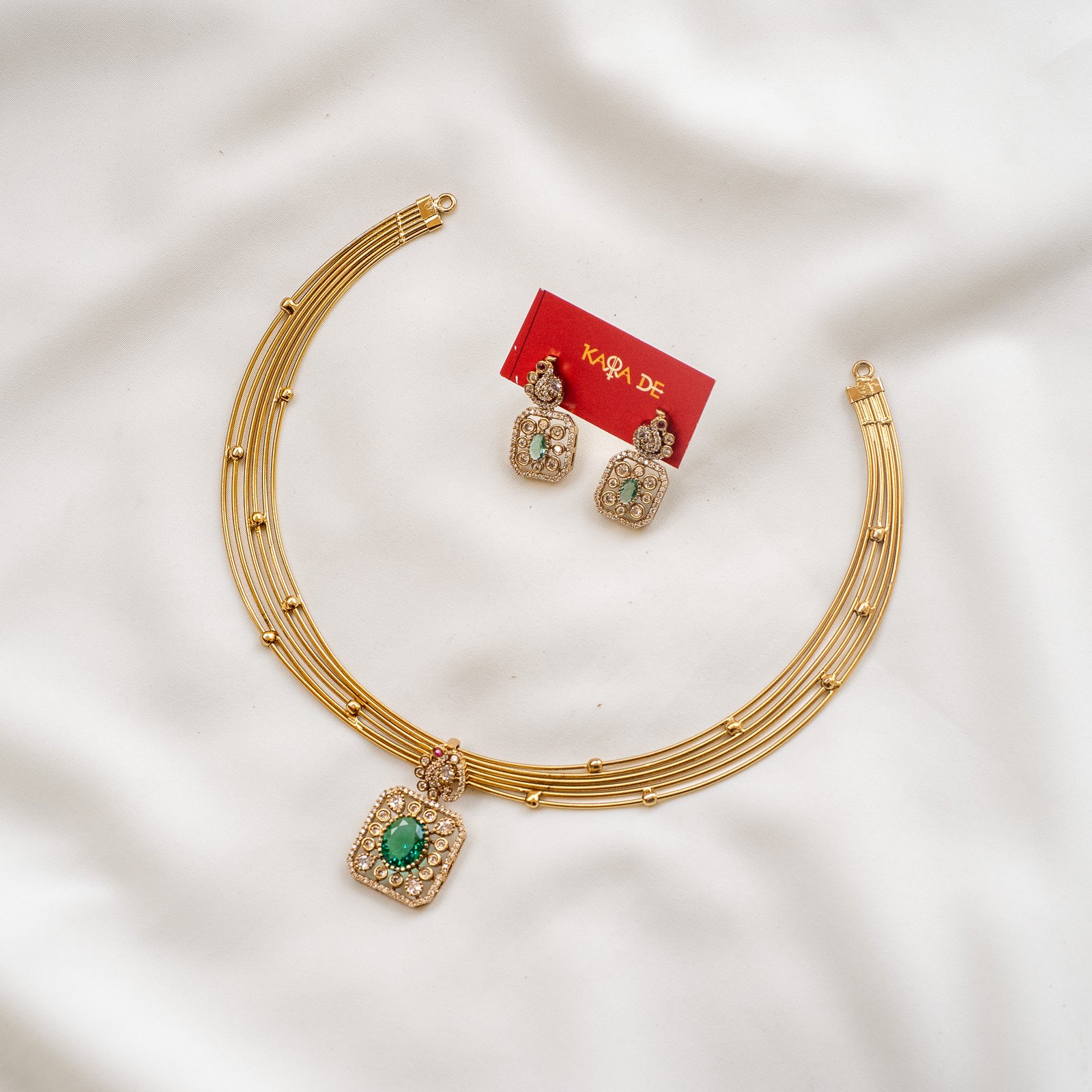 The Emerald Majesty Gold Necklace Set by Karra De radiates timeless beauty. Crafted with a green emerald centerpiece framed by crystal embellishments, this piece adds luxury and poise to festive and bridal outfits. Ideal for elegant women who prefer statement jewelry with traditional flair.