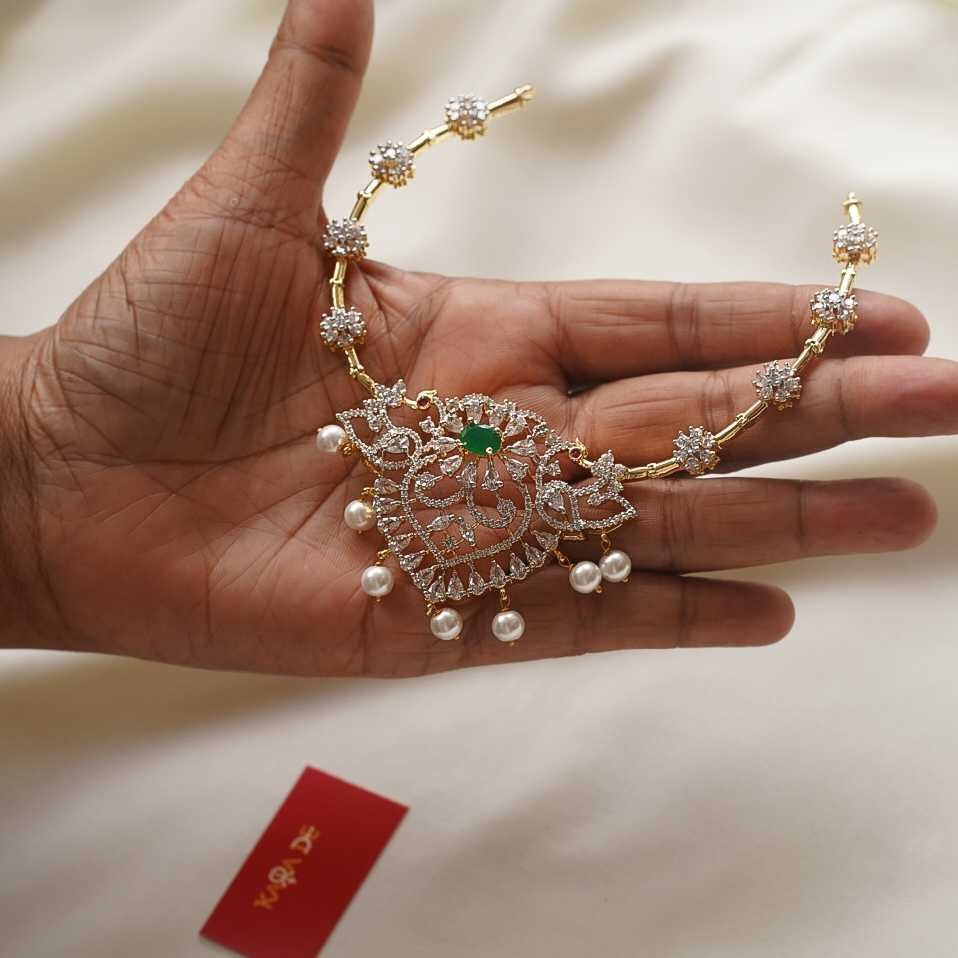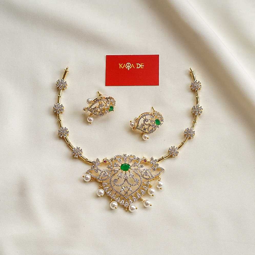 The Emerald Pearl Diamond Neckpiece Set by Karra De captures bridal opulence with emerald, pearls, and dazzling diamonds. Designed for elegance and everlasting beauty.