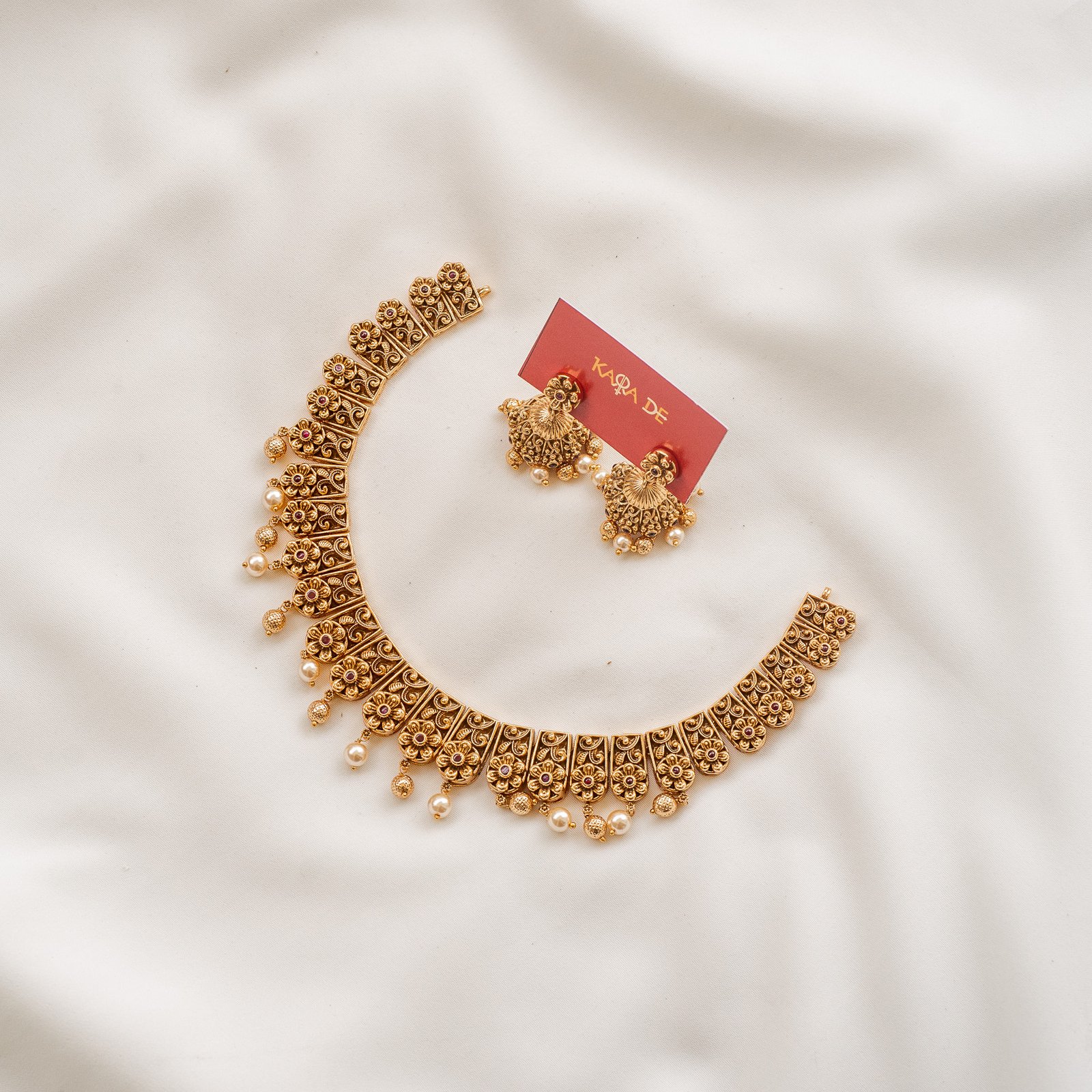 The Floral Heritage Pearl Choker Set from Karra De brings timeless elegance to your jewelry collection. Handcrafted in antique gold with intricate floral motifs and pearl accents, this choker is ideal for traditional occasions, temple ceremonies, and ethnic celebrations.