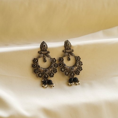 Oxidised hoop earrings with floral carvings for a fusion ethnic look. Ideal for weddings, festivals, and ethnic styling. Lightweight, skin‑friendly, and made with premium oxidised alloy.