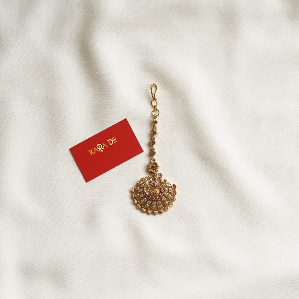 The Floral Ruby Kundan Maang Tikka by Karra De captures the essence of heritage with its intricate floral motifs. Adorned with shimmering kundan and ruby stones, it adds a luxurious charm to bridal and festive ensembles.