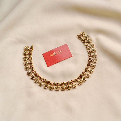 Handcrafted with high‑quality gold plating and floral stone embellishments, this necklace sits beautifully as a collar‑length piece, adding charm to bridal and festive wear.