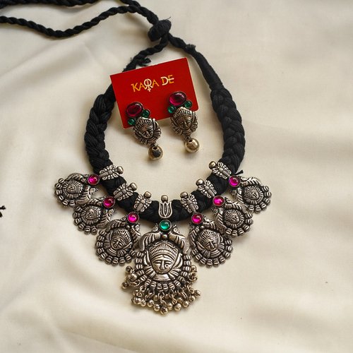 Artisan-made tribal oxidised necklace set with bold motifs and colourful stones. This handcrafted piece from Karra De is made using high‑quality oxidised alloy, designed to be lightweight, skin‑friendly, and durable. Perfect for weddings, festive celebrations, parties, and cultural events. A must-have statement jewellery piece for every ethnic wardrobe.
