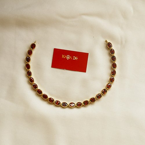 Karra De’s Heritage Temple Square Motif Necklace is an ode to traditional temple jewelry, featuring square motifs adorned with ruby, emerald, and crystal stones — perfect for grand occasions.