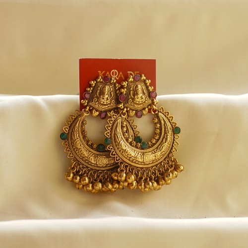 Antique crescent-shaped earrings with Lakshmi motifs and colorful stone accents.
