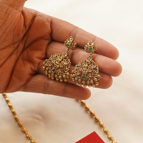 The Lakshmi Pendant Gold Set from Karra De is a magnificent antique piece featuring a detailed Lakshmi motif and embedded ruby and emerald stones. Ideal for weddings and festivals, it symbolizes prosperity and divine charm.