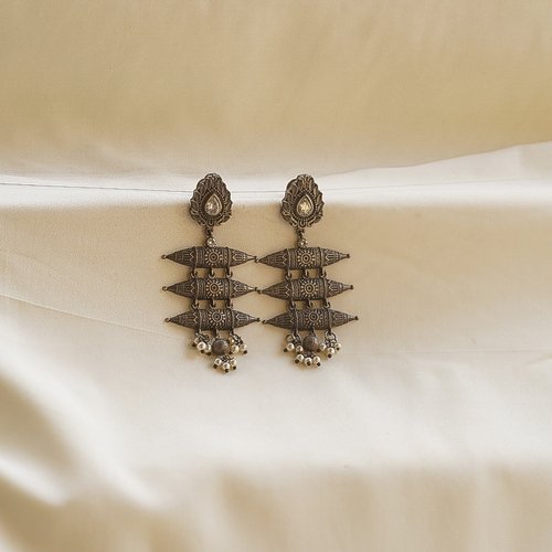 Layered temple-inspired oxidised earrings with hanging beads.