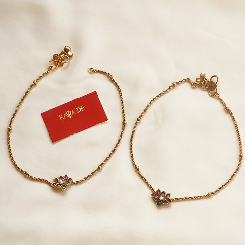 Lotus motif gold anklet pair with ruby and emerald stones by Karra De