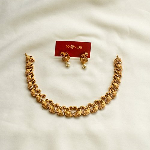 Traditional peacock motif necklace in antique gold with pearl detailing for timeless beauty.