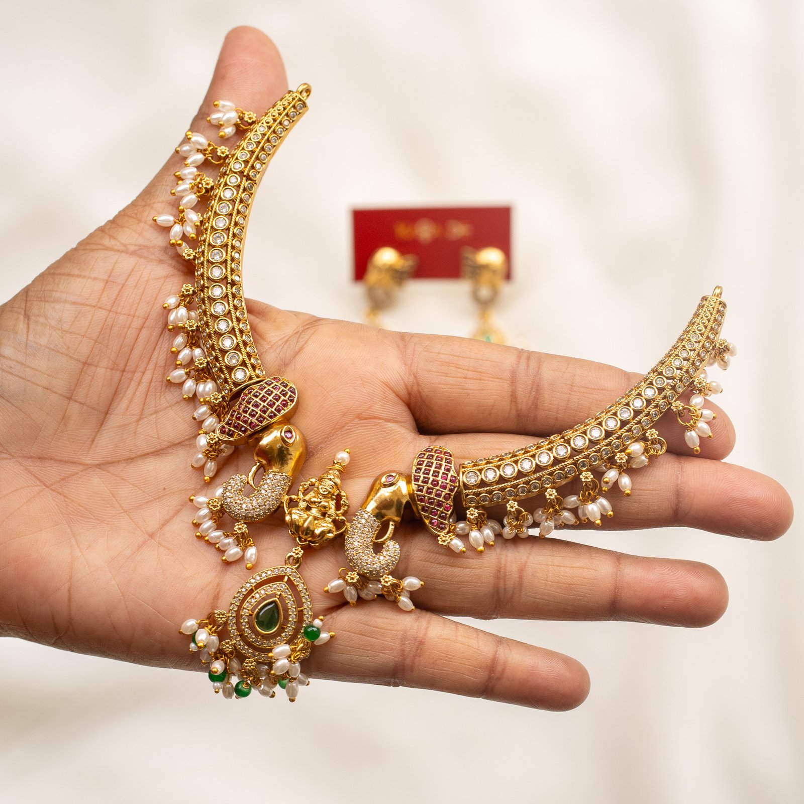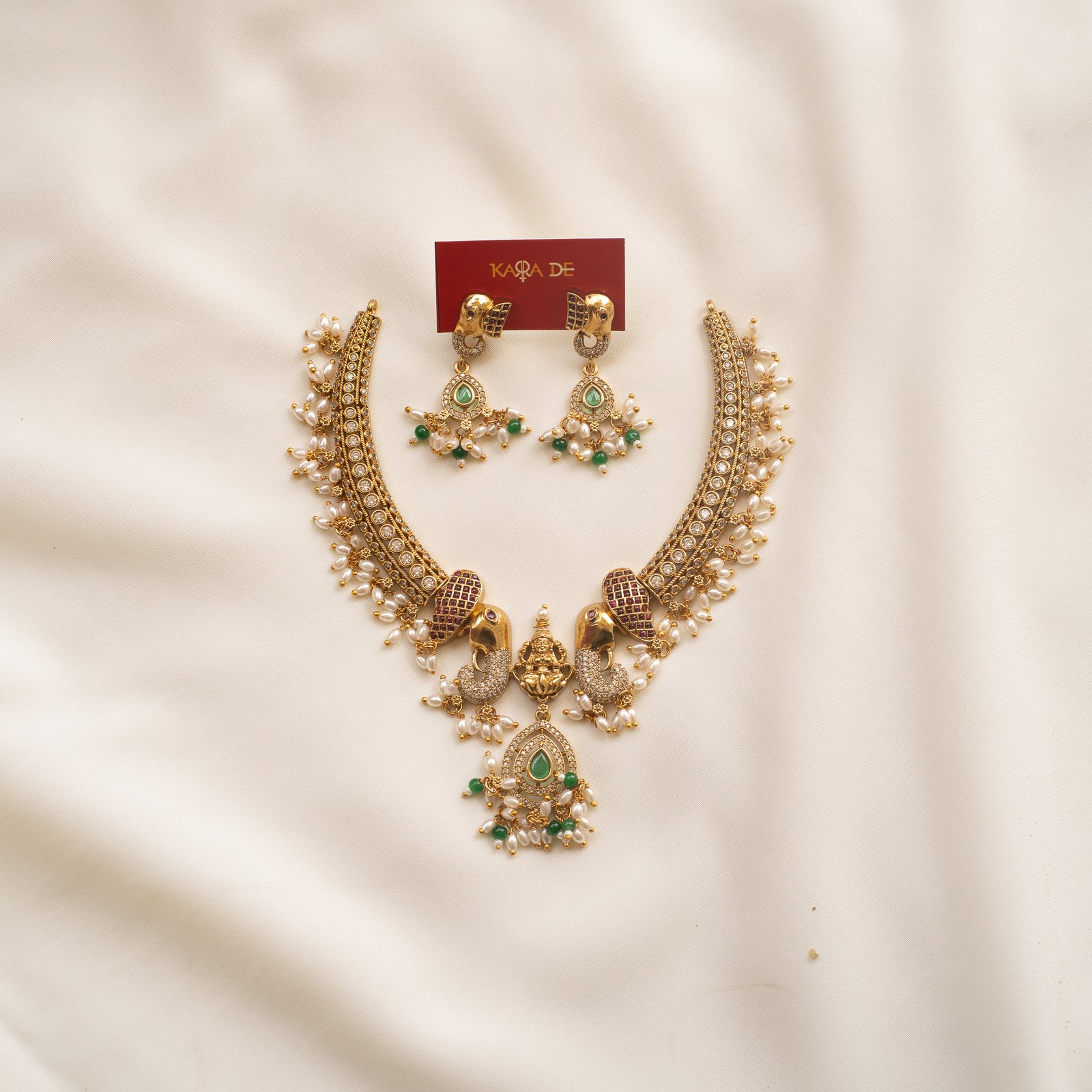 The Peacock Pearl Heritage Necklace Set from Karra De captures the splendor of temple jewelry artistry. Adorned with twin peacock motifs, emerald stones, and delicate pearls, this necklace celebrates Indian craftsmanship and divine elegance — perfect for brides, festive occasions, and temple ceremonies