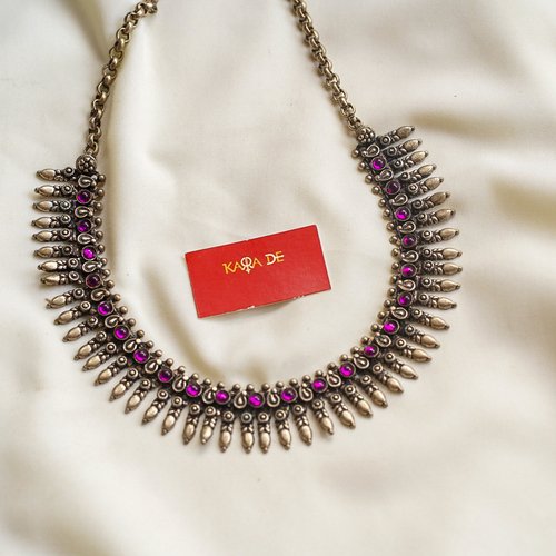 Purple‑stone spike‑design oxidised necklace perfect for bold ethnic fashion. Lightweight, skin‑friendly and crafted with premium oxidised alloy. Perfect for weddings, festivals and elevated ethnic styling.