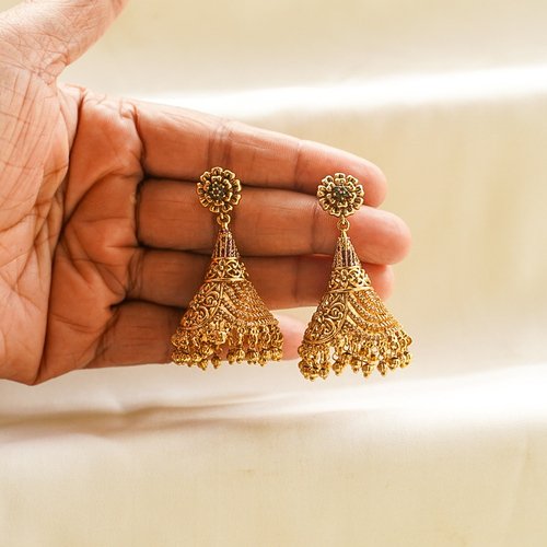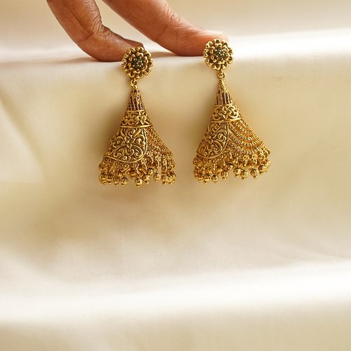 Intricate antique gold temple jhumkas with traditional craftsmanship.