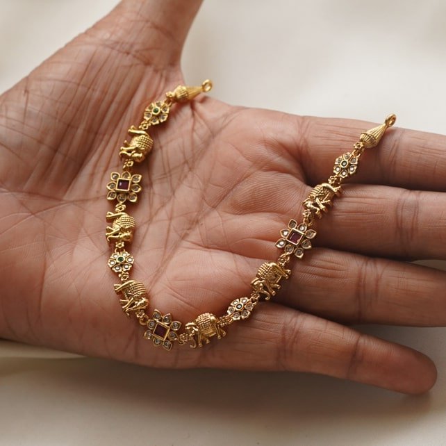 Antique gold neckpiece with detailed elephant motifs and ruby-emerald stones — regal and traditional.