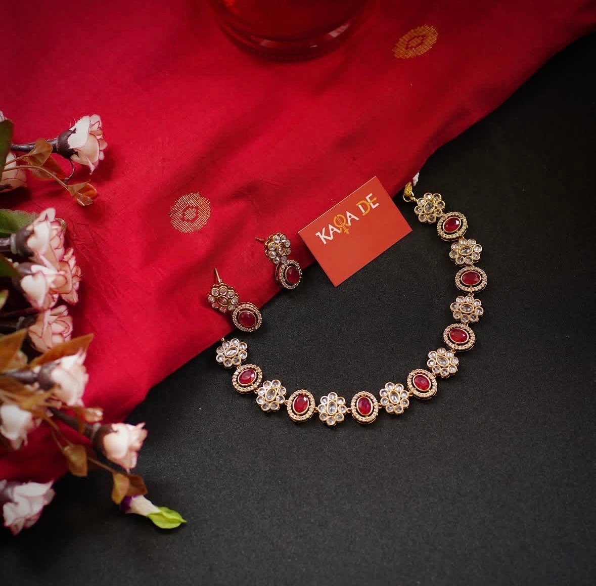 The Ruby Grace Floral Necklace Set by Karra De blends traditional charm with refined beauty. Featuring oval ruby stones and diamond-inspired floral clusters, it’s the ideal piece for wedding wear or festive styling.