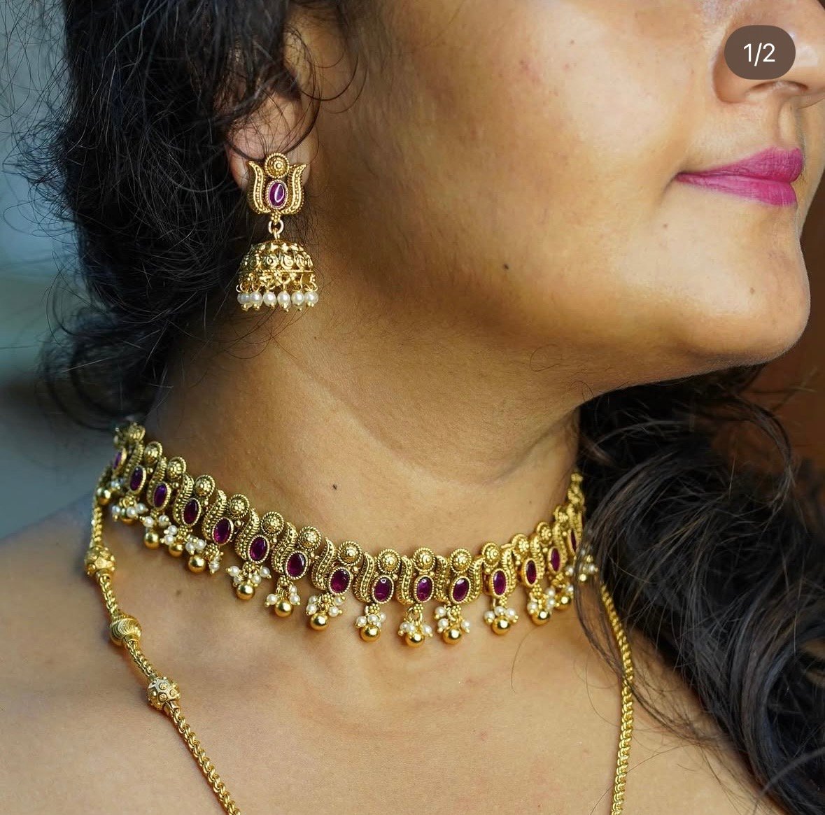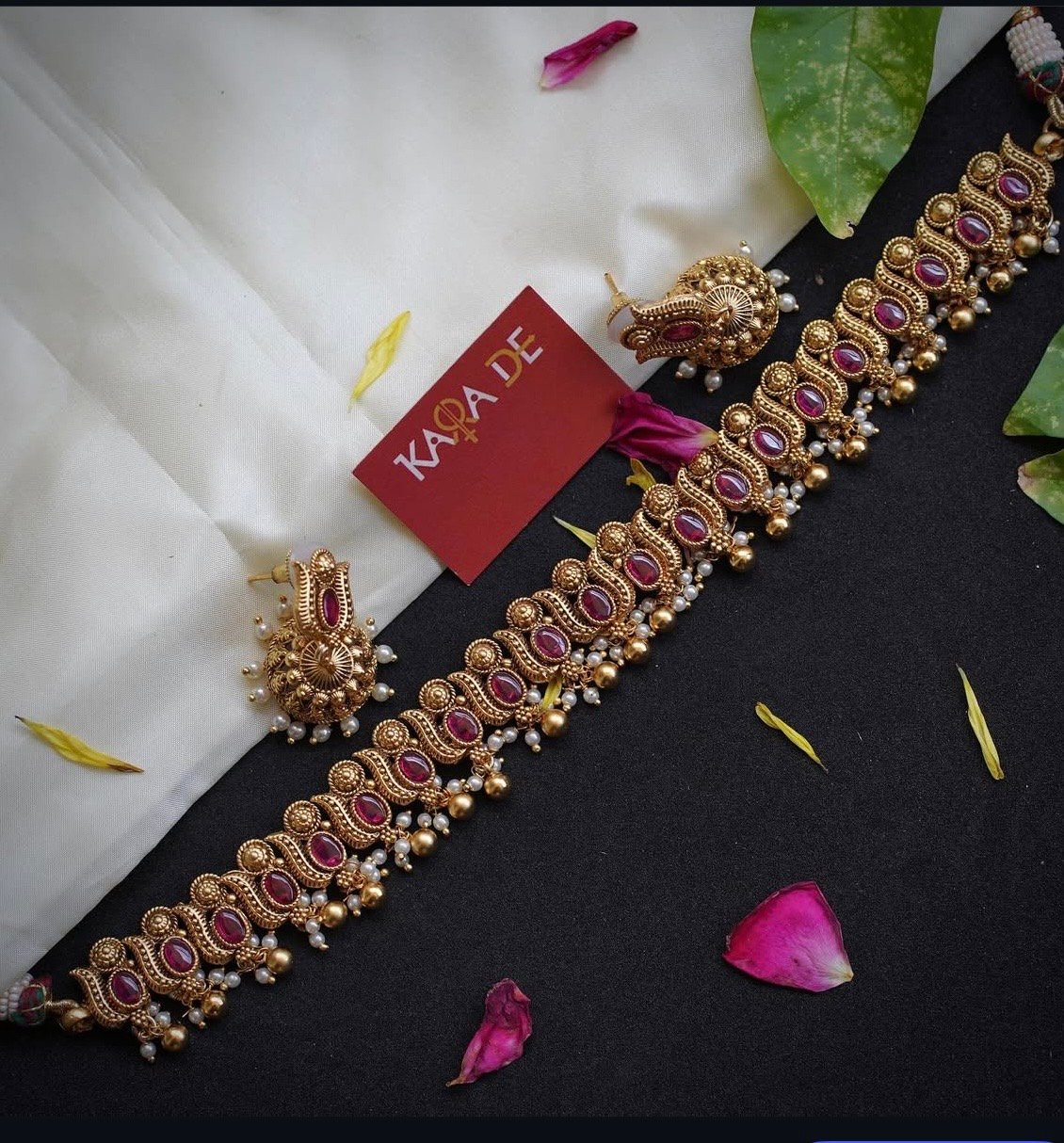 The Ruby Heritage Temple Necklace Set by Karra De is a regal temple jewelry piece inspired by South Indian craftsmanship. Ruby stones set in antique gold frames are complemented by pearl hangings, giving you a royal look perfect for festive and wedding occasions.