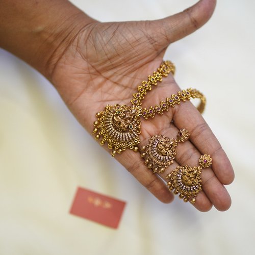The Ruby Lakshmi Antique Haaram Set by Karra De features a detailed Lakshmi pendant surrounded by ruby stones and golden carvings. This temple jewelry exudes a royal aesthetic, perfect for brides seeking traditional South Indian charm.