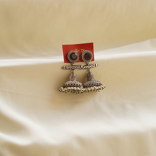 Ruby-studded oxidised silver jhumkas adding bold traditional glamour. Ideal for weddings, festivals, and ethnic styling. Lightweight, skin‑friendly, and made with premium oxidised alloy.