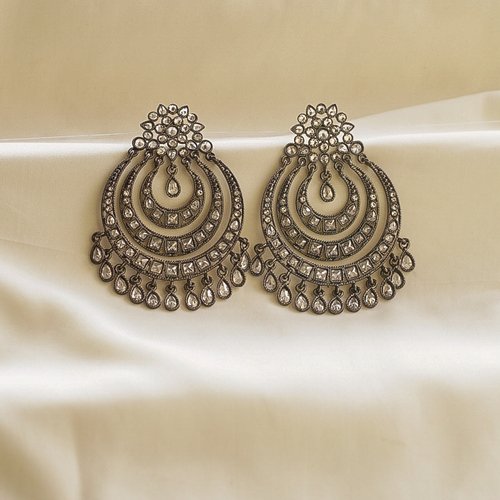 Oxidised silver chandelier earrings with layered kundan design.