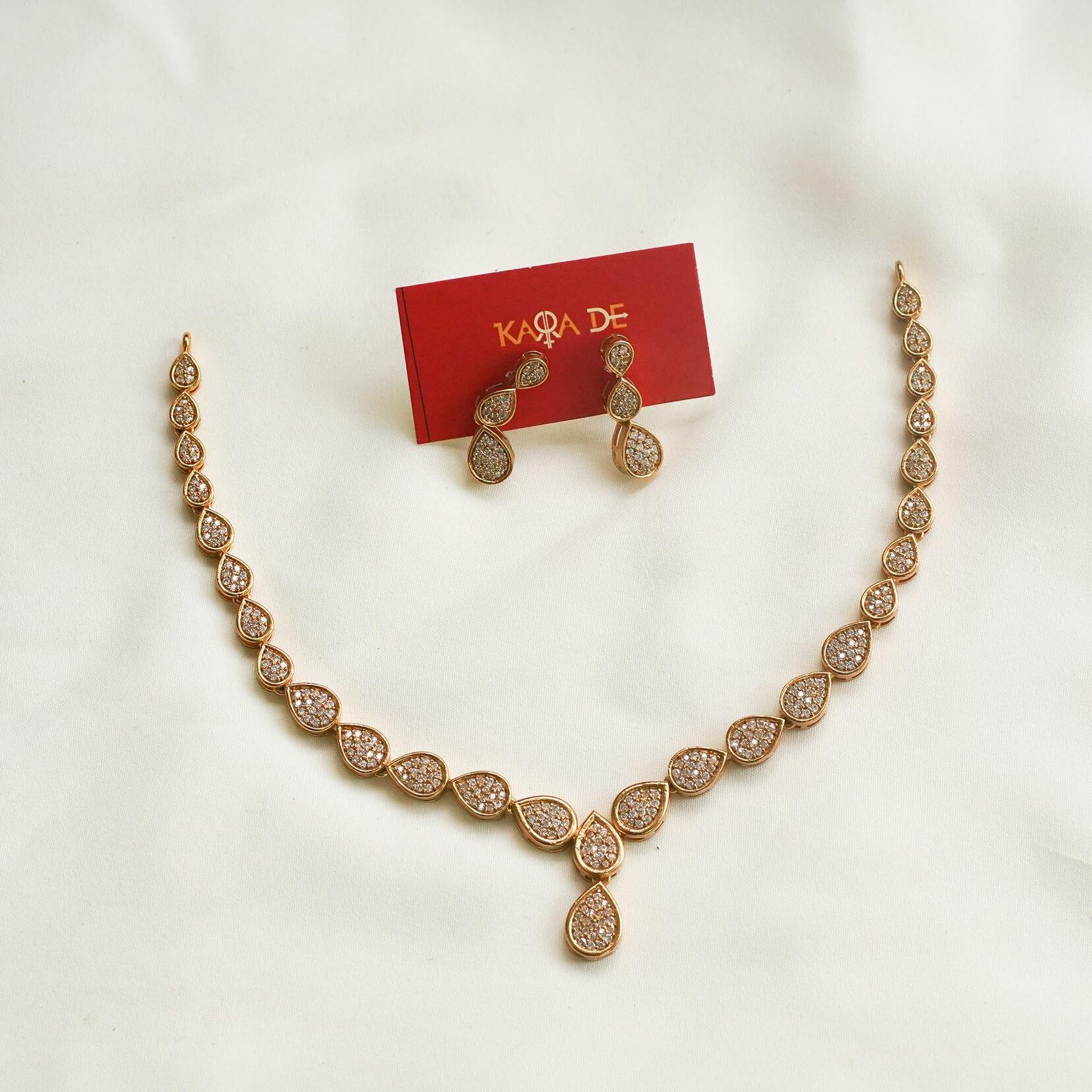 The Teardrop Diamond Necklace Set by Karra De embodies classic charm with its sleek teardrop design. Perfect for evening parties or weddings, this set adds a luxurious sparkle to every outfit.