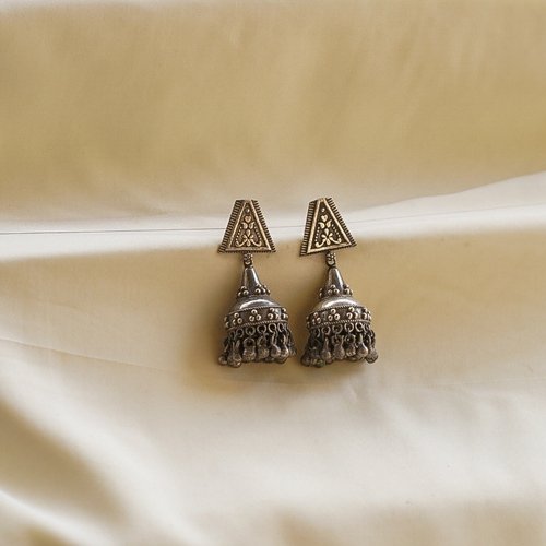 Triangle-top traditional oxidised jhumkas with engraved detailing. Perfect for ethnic styling, festivals, weddings and everyday elegance. Crafted using premium oxidised alloy for comfort and durability.